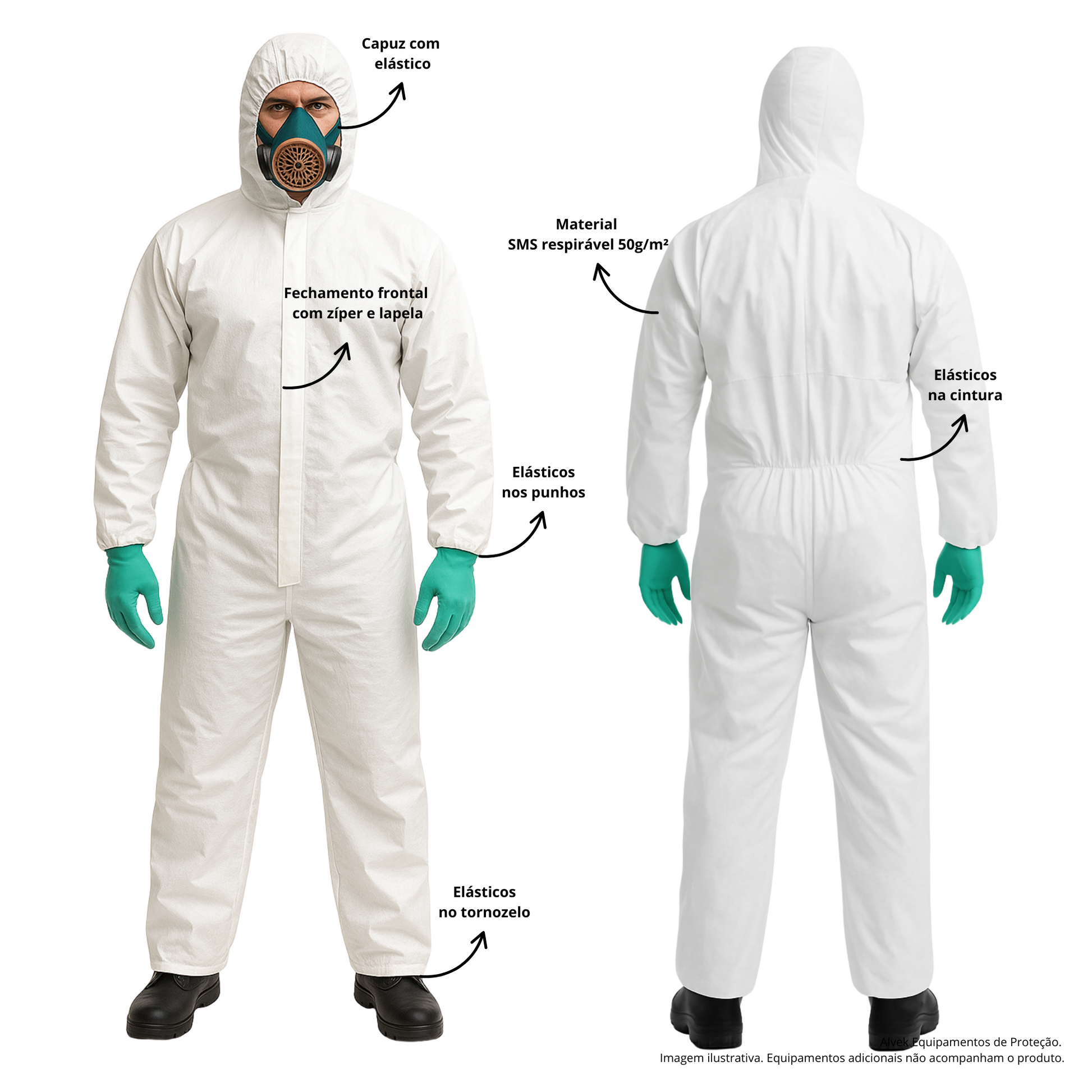- Tecido SMS 50g/m²: Leve, respirável e com barreira química eficiente;
