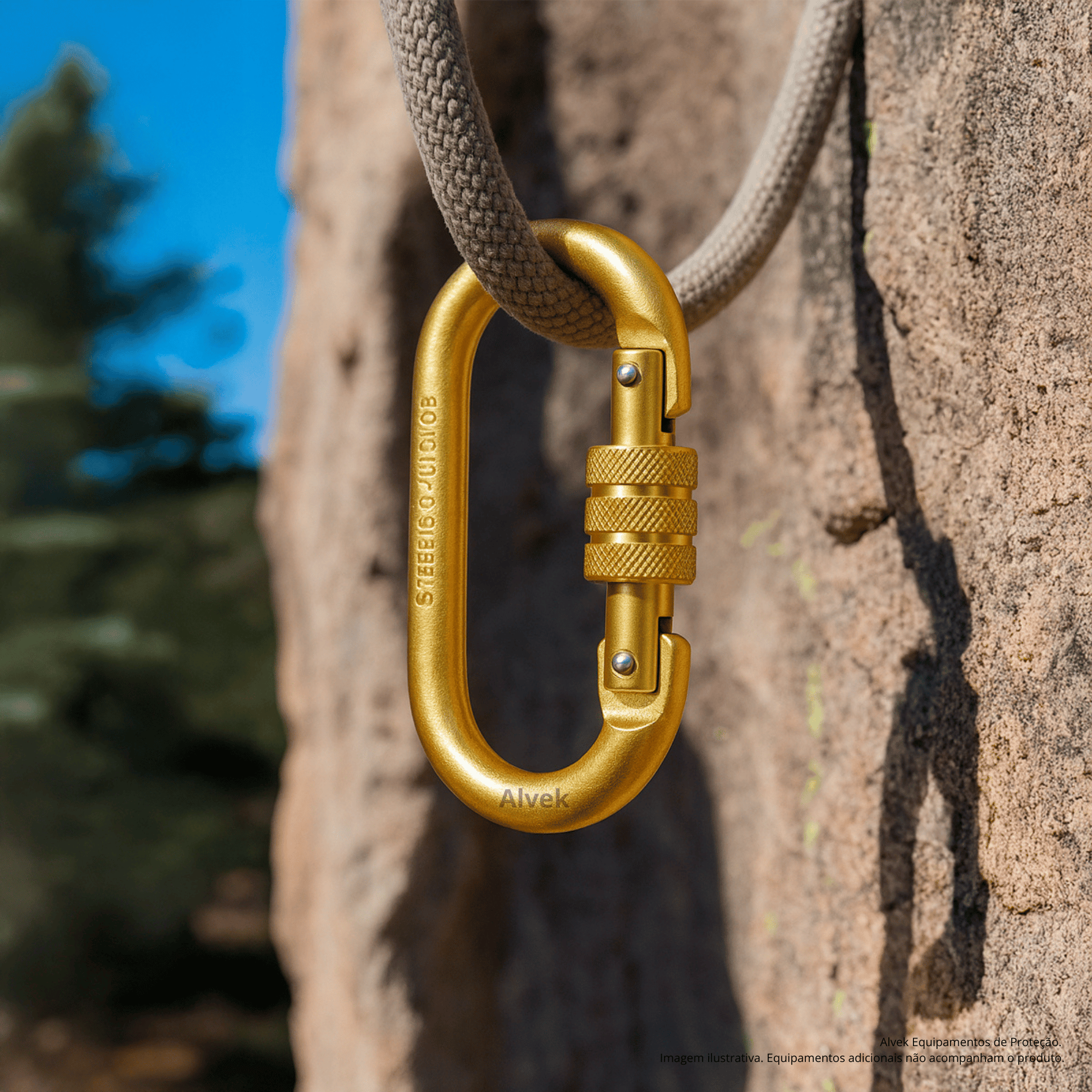 Conector em aço forjado de trava dupla tipo rosca com resistência de 25kN. Desenvolvido como elo de conexão entre sistemas de proteção contra quedas.