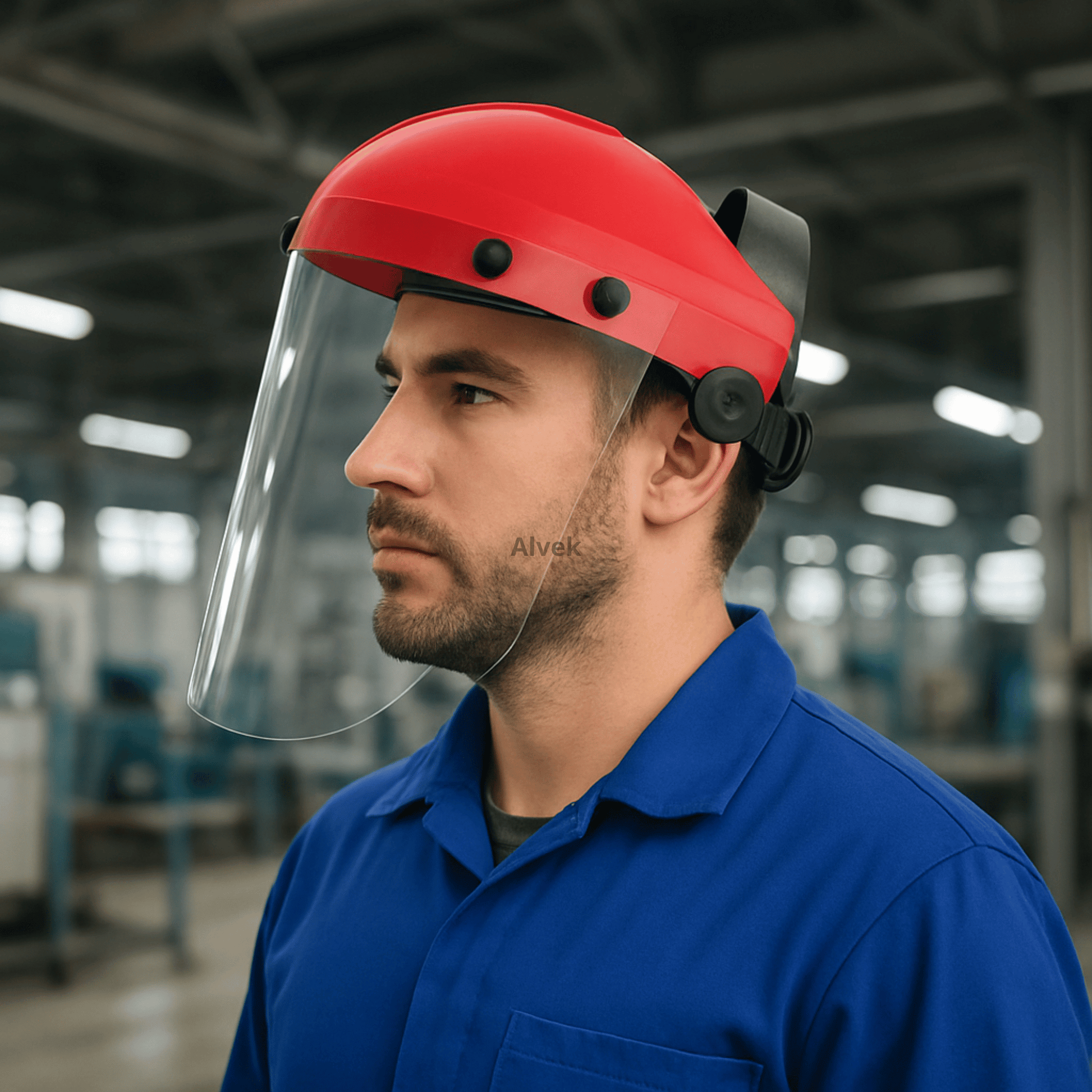 Protetor facial constituído de coroa e carneira de plástico, com regulagem através de catraca. Visor em policarbonato incolor com 8"x15.5" polegadas. Possui tira absorvente de suor.